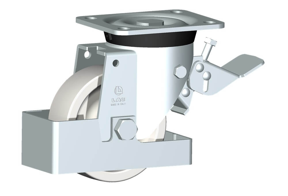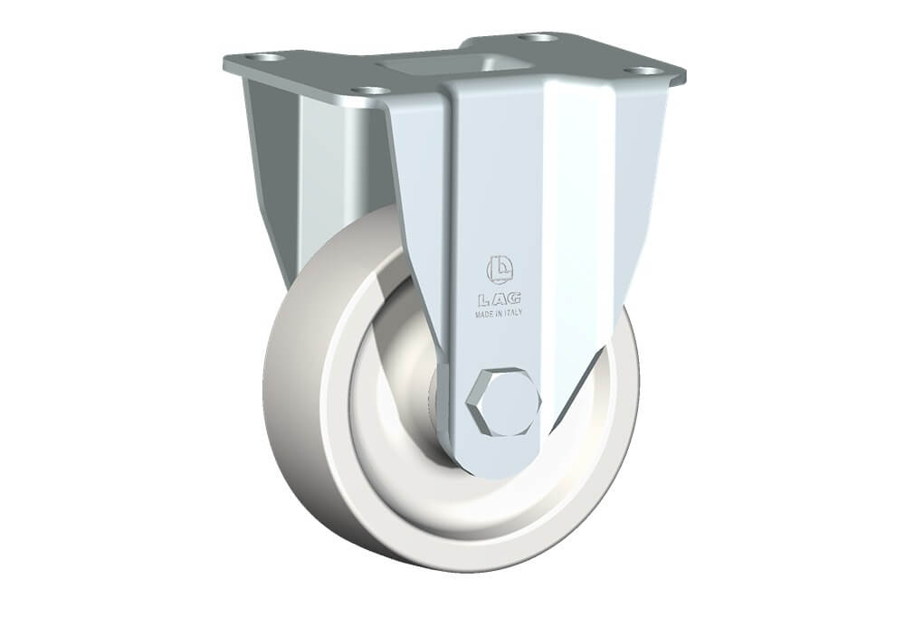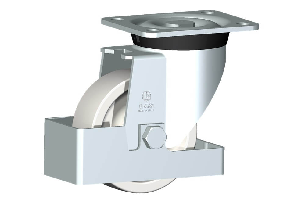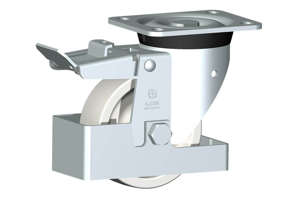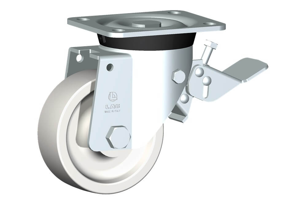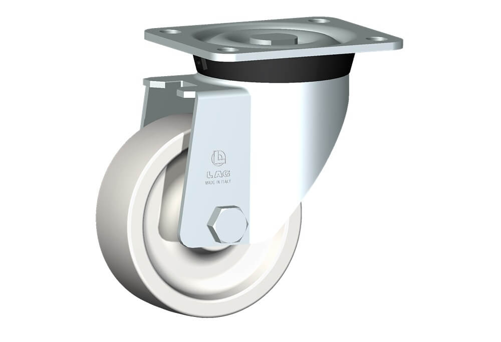 Chapes series M40 avec platine de fixation en tòle d'acier emboitie, pivot central rivé à la platine, avec double anneaux de billes protégés avec étanche (water resistant). Finition; électrozingué,blanc.